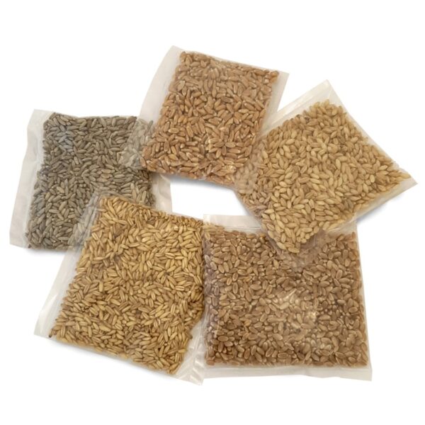 Extra Angebot für Schulen: Je 20 Halme Weizen, Gerste, Roggen, Hafer, Korn/Dinkel als komplettes Paket. Jede Sorte angeschrieben, plus eine Getreidebroschüre gratis dazu.